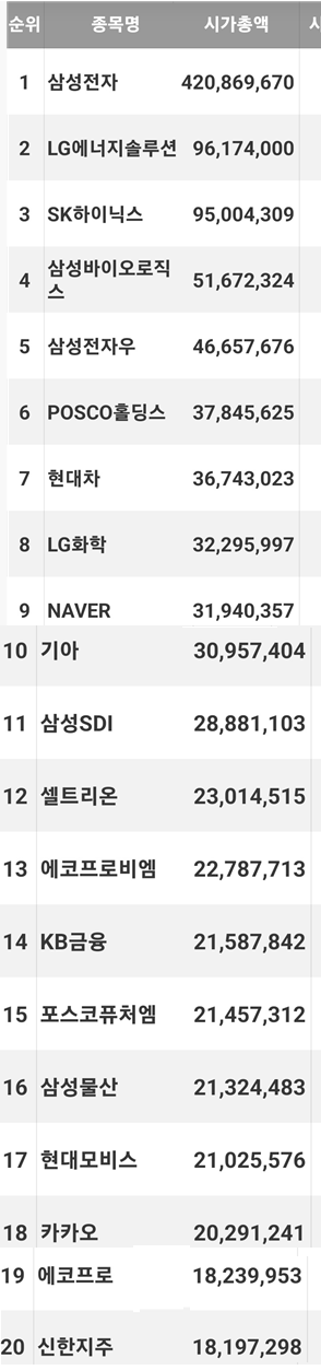 이 20개 기업의 시가총액이 상장종목 전체 시가총액의 약 45%를 차지하고 있습니다.